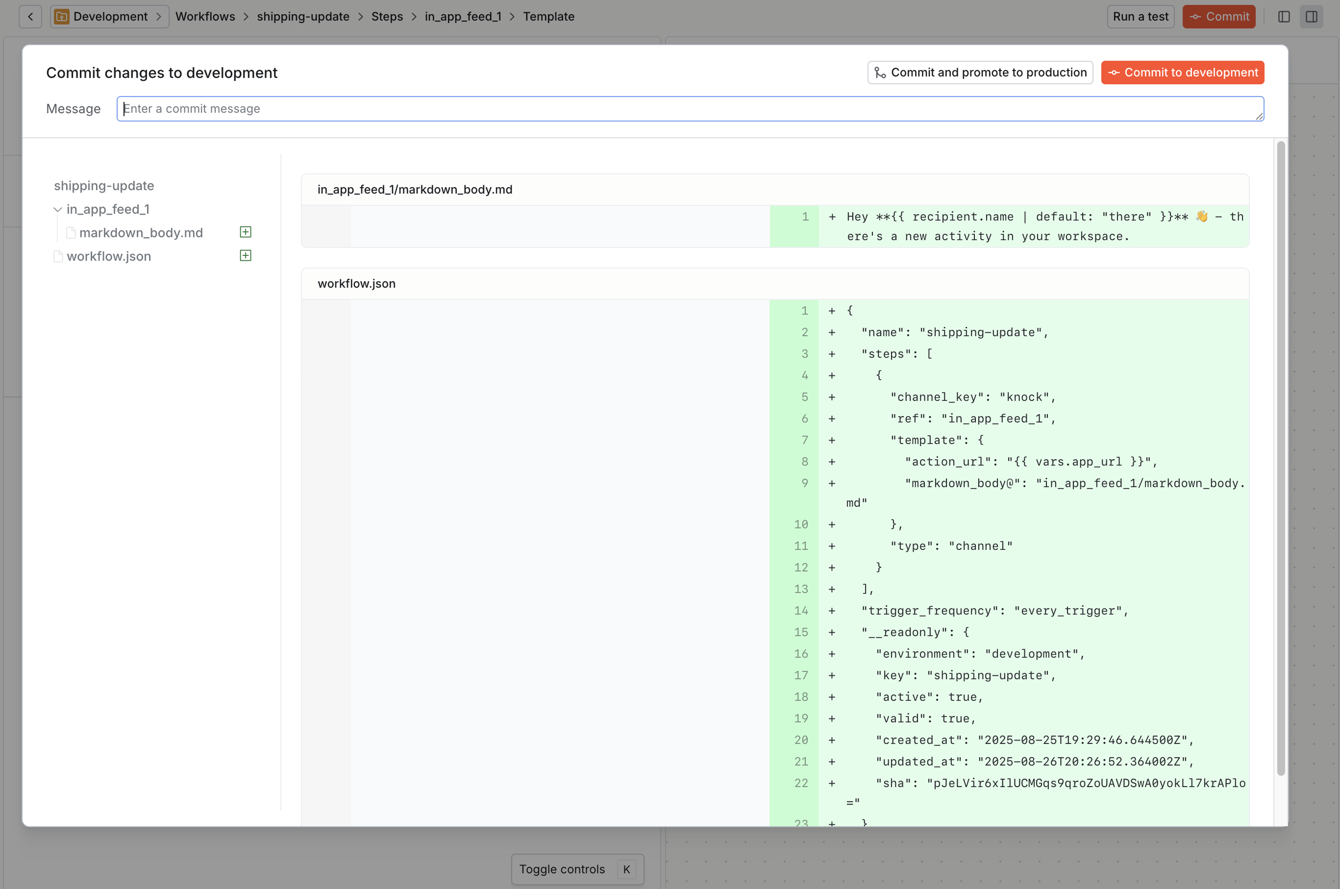 Knock uses logically separated environments to control the roll-out of your notifications. When you're happy with the way your workflows work and look, ensure they're in your production environment to start sending notifications to your real users. You can create workflows directly in production, or create them in development and promote them to production.